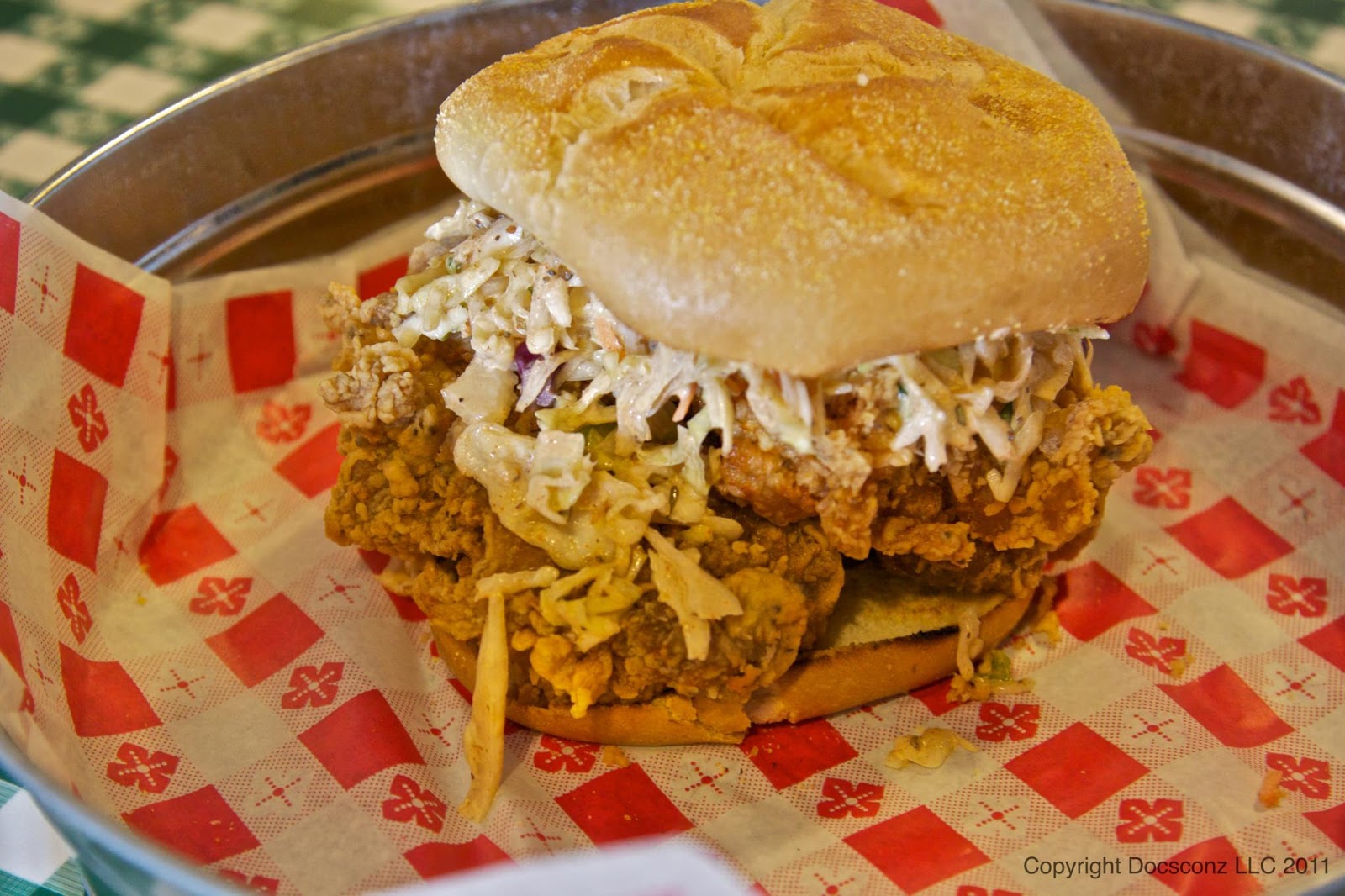 A big, thick, boneless chicken thigh. (Wait! What?) Yep, no breast meat here. That right there is genius. Dark meat is so much more flavorful than breast meat, and it usually stays juicier and more tender too. That big thigh is then coated in Hattie’s famous flavor packed breading and fried to a nirvana inducing crunchiness.