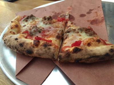 The pizza below was made in error and they graciously asked if I’d like a slice or two. Sausage, tomato, and cheese. I was happy to oblige! The crust on this pie, as you can see, is darker than my Valentina, but still was light and chewy, with good crunch.