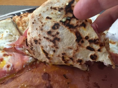 I broke that sunny side up yolk, and watched with glee as it ran over the pizza. The ham was mild but tasty, as was the cheese. Just look at how bubbly, and airy the crust is. It’s light, but chewy. Although it looked a bit pale, it’s crunchy in spots with a fair amount of char (especially on the bottom crust) and has really good flavor. If I had to guess, I’d say it’s about 10 inches in diameter, it’s plenty for one, or enough for two or three to share as appetizer.