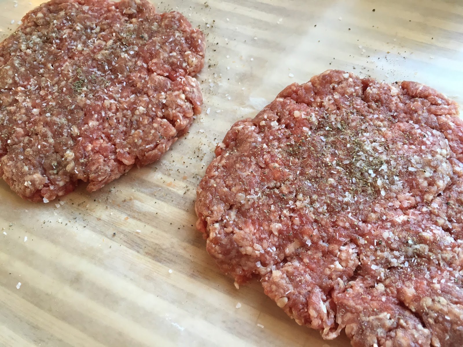 I cut off a hunk of beef from one of the tubes Jon gave me and it weighed about 9 ounces. That was just about perfect. When I make burgers at home, I always do two patties of 4 ounces each. Anything more than 8 ounces is just too much beef in my opinion.