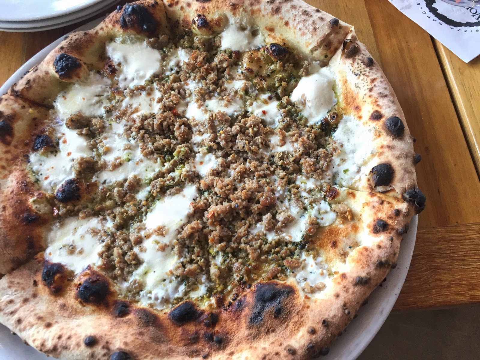 Usually, I’d order a Margherita when trying a pizza joint for the first time, but I decided to break with tradition and heed the consensus of the internet and have the pistachio pie. Pistachio pesto, mozzarella, sausage, pecorino.