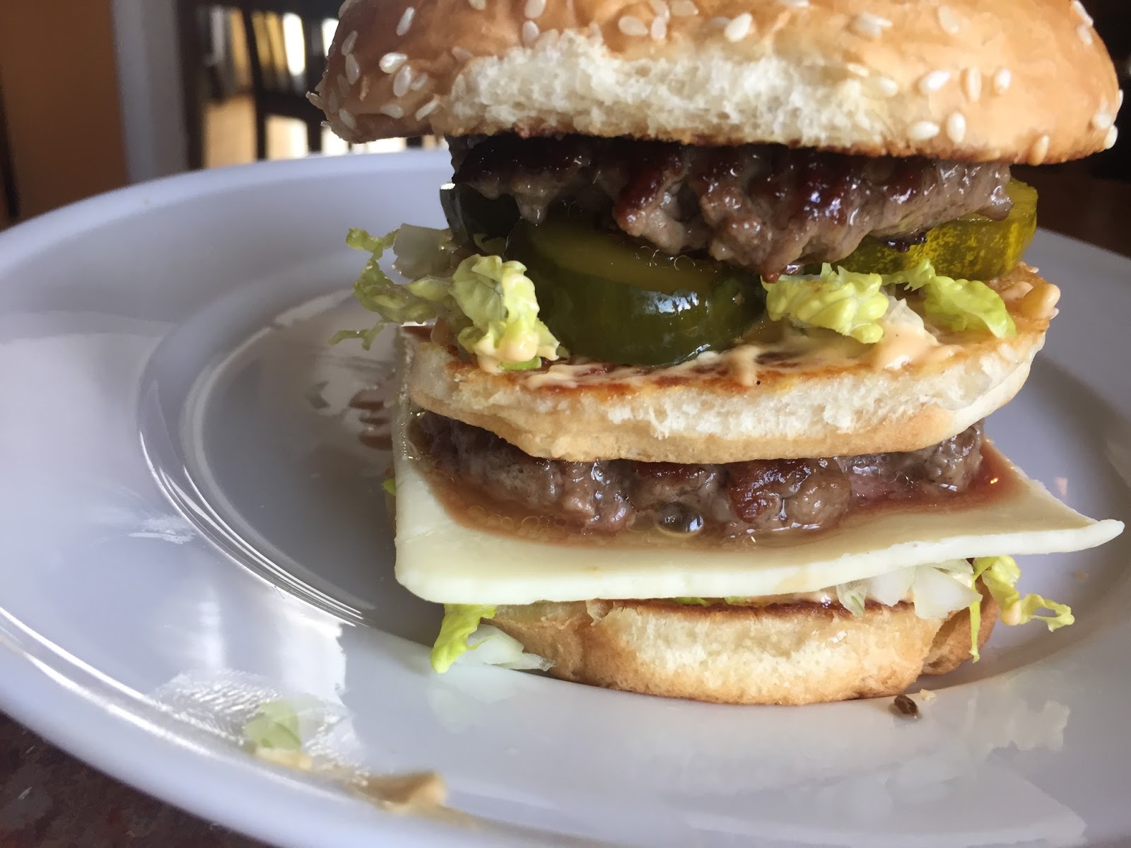 I generously salted the beef patties, which I always do when making burgers, but I think that was a mistake. The Mickey D’s special sauce is very salty on its own, and I probably should’ve cooked the burgers sans salt. Also, my pickle slices are thick, and they added a lot of vinegary tanginess, which also isn’t needed because the special sauce is very tangy (and also has chopped pickles in it). Next time I’d use thinly sliced, milder flavored pickles.