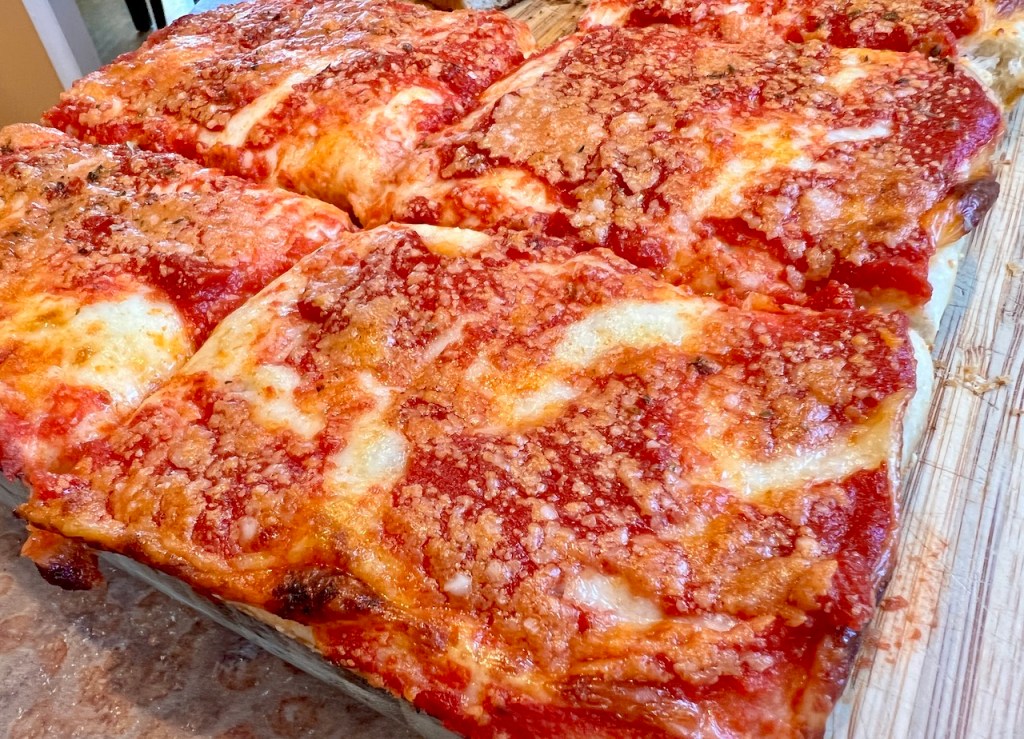 Thick and pillowy upside down Sicilian inspired by L&B Spumoni Gardens in Brooklyn.